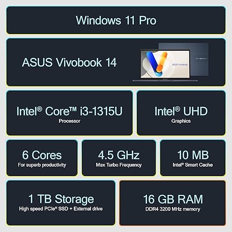 ASUS Vivobook Laptop 2025 Ultra Portable Business Computer, 14" FHD Display, 16GB RAM, 1TB Storage (512GB SSD + 500GB Ext), 6-Core Intel i3-1315U, MarxsolAccessory, Win 11 Pro, Lifetime Office 2024