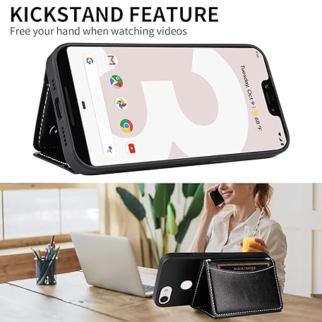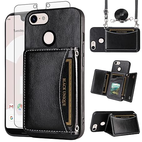 Asuwish Phone Case for Google Pixel 3 XL Wallet Cover with Tempered Glass Screen Protector Credit Card Holder Slot Crossbody Strap Cell Accessories Pixel3XL Pixel3 LX Pixle 3XL Women Girls Men Black