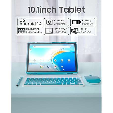 Thông tin sản phẩm ATOZEE Tablet 2 in 1 Android 14 Tablet with Keyboard 10 inch Tabletas, Include Mouse Stylus Pen Case, 6000mAh 6GB+32GB ROM 1TB Expandable Tableta, 2MP+8MP Dual Camera, WiFi-6 BT Tablets PC.