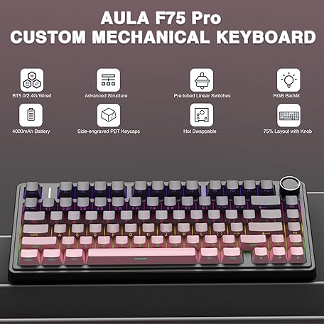 Sản phẩm AULA F75 Pro Wireless Mechanical Keyboard,75% Hot Swappable Custom Keyboard,RGB Backlit,Pre-lubed Reaper Switches,Side Printed PBT Keycaps Mechanical Gaming Keyboards, Pink&Black đang được bán với giá ưu đãi là $75.8967 tại nước Mỹ.