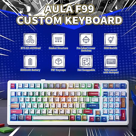 • Aula F99 Mechanical Gaming Keyboard, Wireless Creamy Keyboard Hot Swappable Custom Bluetooth Computer Keyboards, Tri-Mode BT5.0/2.4GHz/USB-C, Pre-lubed Linear Switches, RGB Backlit, Gasket Structure