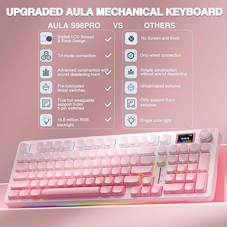 AULA S98 Pro Wireless Mechanical Keyboard with Screen & Knob,2.4GHz/USB-C/BT5.0 Hot Swappable Pink Creamy Keyboard,Pre-lubed Linear Switches,Side Printed PBT Keycaps,RGB Backlit Gaming Keyboards