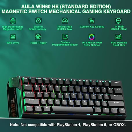 Thông tin sản phẩm Aula WIN60 HE - 60% Mechanical Gaming Keyboard Wired, Magnetic Switch Hot Swappable, Adjustable Actuation Rapid Trigger Mode, 8000 Hz Polling Rate, RGB Small Keyboard 60 Percent Compact Design for PC