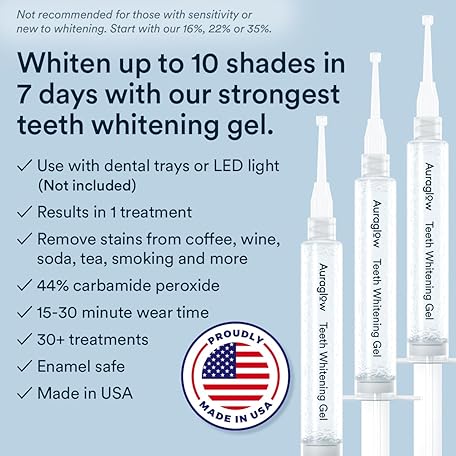 Thông tin sản phẩm AURAGLOW 44% Teeth Whitening Gel Syringe Refill Pack, 44% Carbamide Peroxide, (3X) 5ml Syringes, 30 Whitening Treatments
