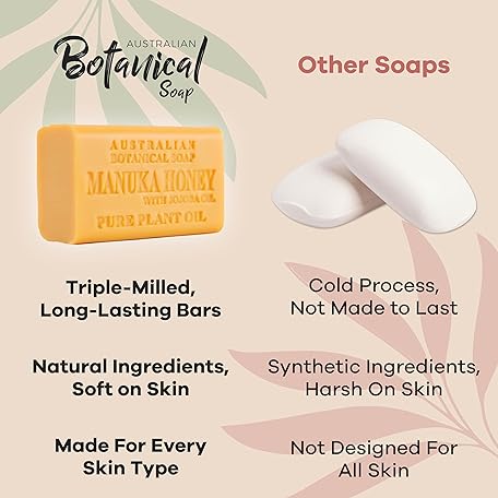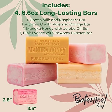 Australian Botanical Goats Milk Soap, Raspberry, Manuka Honey, Pink Lychee and Valencia Orange 6.6 OZ, Luxury Soap Bars Enriched with Shea Butter, Suitable for all Skin Types, Pack of 4
