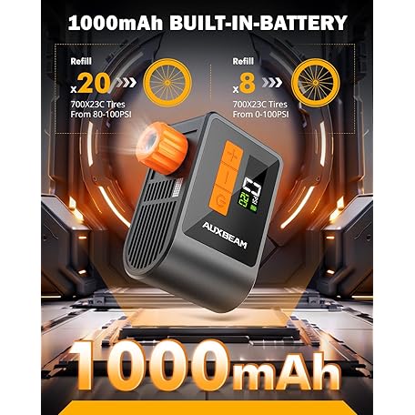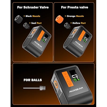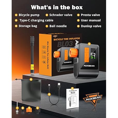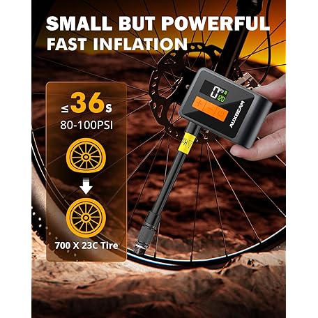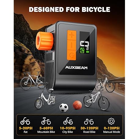 Thông tin sản phẩm Auxbeam Tiny Bike Pump with Gauge, 120PSI Electric Bicycle Pump with Presta and Schrader Valve, Portable Air Pump for Road Bike, City, Mountain and E-Bike