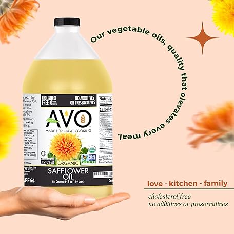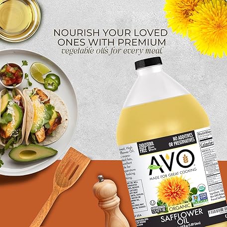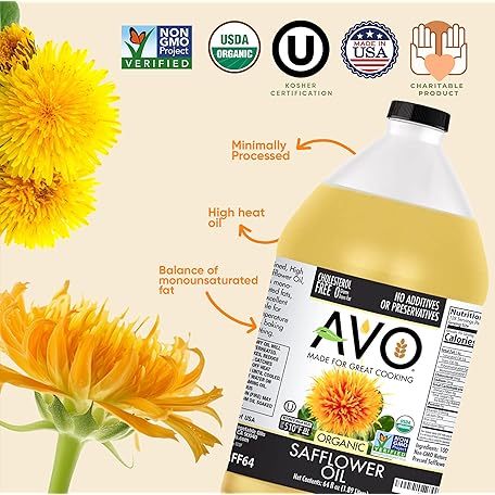Thông tin sản phẩm AVO Organic High Oleic Safflower Oil - Frying, Baking, Non-stick Sautéing, Salads, Vinaigrette, Marinades, Pan Coating, General Cooking 64 Fl-oz (Half a Gallon), No preservatives, Naturally Processed
