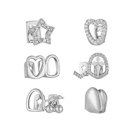 Axepet 6PCs Grillz for Women Hip-Hop Punk Rhinestones Cross Grillz Hollow Out Heart Star tooth cap Gold Plated Silver Grills for Your Teeth
