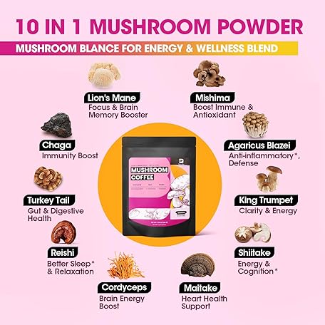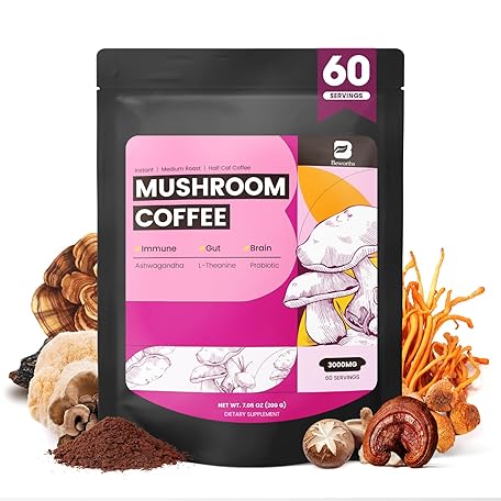 B BEWORTHS Mushroom Coffee, Slim Mushrooms Coffee Powder with Ashwagandha, Prebiotics, L-theanine, Lion's Mane, Reishi, Chaga, Turkey Tail, Mixed Arabica Instant Coffe for Focus, Immune & Gut Health