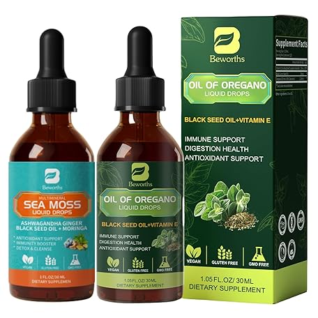 B BEWOTHS Irish Sea Moss Chlorophyll Liquid with Black Seed Oil, Ashwagandha, Moringa, Turmeric, Elderberry + Oregano Oil Drops, Oil of Oregano with Black Seed Oil,