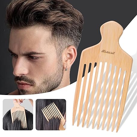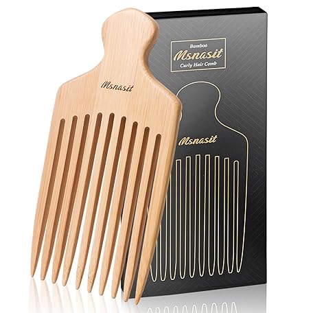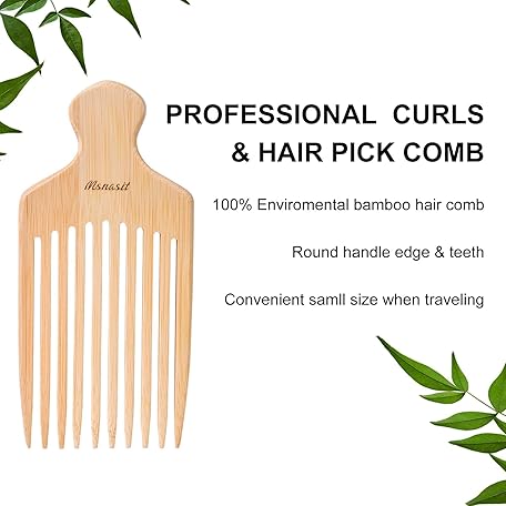 Bamboo Hair Pick for Curly Hair, Premium Wooden Wide Tooth Detangling Comb with Ergonomic Handle, Natural Volume & Styling Tool for Men Women, Fine or Thick Beard Pick