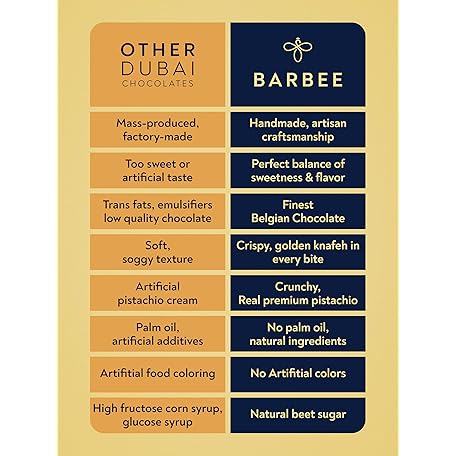 Thương hiệu BARBEE là cái tên nổi tiếng được rất nhiều khách hàng trên thế giới chọn lựa. Với kiểu dáng đẹp mắt, sang trọng, sản phẩm BARBEE Dubai Chocolates with Handmade Belgian Chocolate – Pistachio Milk Chocolate Flavour With Creamy & Crunchy Knafeh Centre, No Palm Oil, 6.7 oz (190g) là sự lựa chọn hoàn hảo nếu bạn đang tìm mua một món cho riêng mình.
