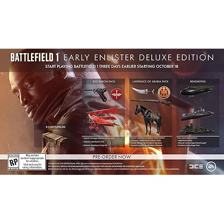 Thương hiệu Electronic Arts là cái tên nổi tiếng được rất nhiều khách hàng trên thế giới chọn lựa. Với kiểu dáng đẹp mắt, sang trọng, sản phẩm Battlefield 1 Early Enlister Deluxe Edition - PlayStation 4 là sự lựa chọn hoàn hảo nếu bạn đang tìm mua một món cho riêng mình.