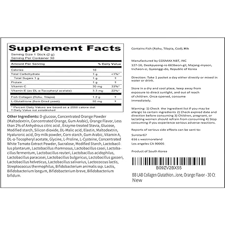 Sản phẩm BB LAB Collagen Glutathione White, Low Molecular Korean Stick Supplement, Fish Peptides, Vitamin C, Vitamin E, Glutathione, Fast abosorption, Orange Flavor đang được bán với giá ưu đãi là $21.7891 tại nước Mỹ.