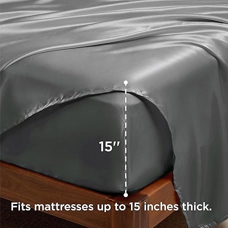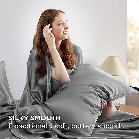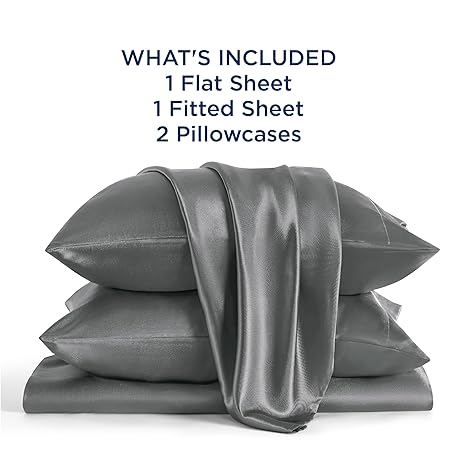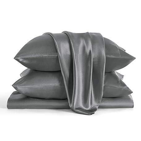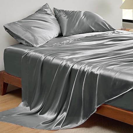 Bedsure Satin Sheets Queen Size - 4 Piece Silky Bedsheets with 15 Inches Deep Pocket Fitted Bedsheet,1 Flat Sheet, 2 Satin Pillowcases, Good for Hair & Skin (Queen, Dark Grey)