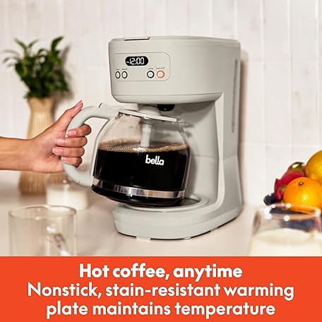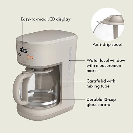 Thông tin sản phẩm BELLA 12 Cup Programmable Coffee Marker, Reusable Dishwasher Safe Accessories, Easy LCD diaply, Auto Shutoff, 900 watt, Oatmilk