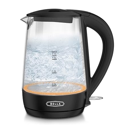 BELLA 1.7 Liter Glass Electric Kettle, Quickly Boil 7 Cups of Water in 6-7 Minutes, Soft Orange LED Lights Illuminate While Boiling, Cordless Portable Water Heater, Carefree Auto Shut-Off, Black