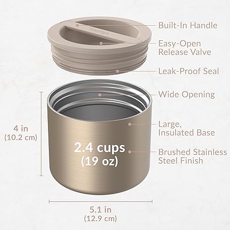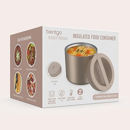 Thông tin sản phẩm Bentgo Stainless Insulated Food Container - 2.4 Cups (19 oz), Triple-Layer Insulation, Vacuum Seal, Leak-Proof, Built-In Handle, Wide Opening, Premium Stainless Steel, for Cool/Warm Foods (Gold)