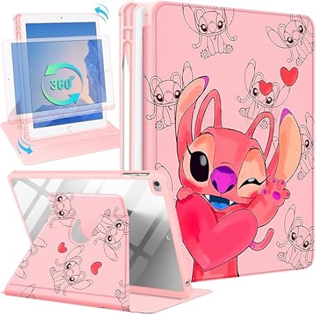Besoar Cute Case for iPad 5th/6th/Air 1/Air 2/Pro 9.7 for Girls Kids Girly - Women Cartoon Kawaii Design Covers, 360 Rotating Folio Stand with Pencil Holder, PK Heart