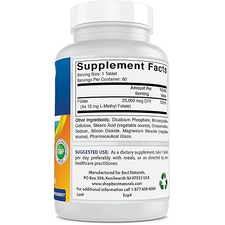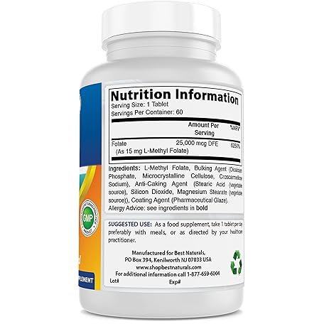 Thông tin sản phẩm Best Naturals Methyl Folate 15000 mcg (15mg) (Most Bio-Available) 60 Tablets - Supports Cell Formation Growth Function, Brain, Memory, Cardiovascular Health (60 Count (Pack of 1))