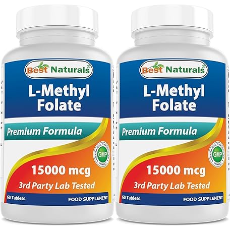 Best Naturals Methyl Folate 15000 mcg (15mg) (Most Bio-Available) 60 Tablets - Supports Cell Formation Growth Function, Brain, Memory, Cardiovascular Health (60 Count (Pack of 2))