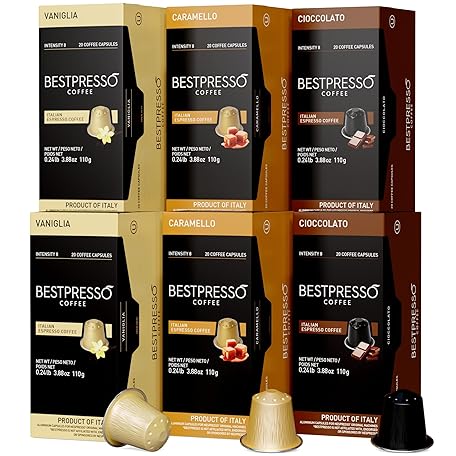 Sản phẩm Bestpresso Coffee for Nespresso Original Machine 120 Aluminum pods Certified Genuine Espresso Variety Pack Caramel,Vanilla and Chocolate đang được bán với giá ưu đãi là $43.5891 tại nước Mỹ.