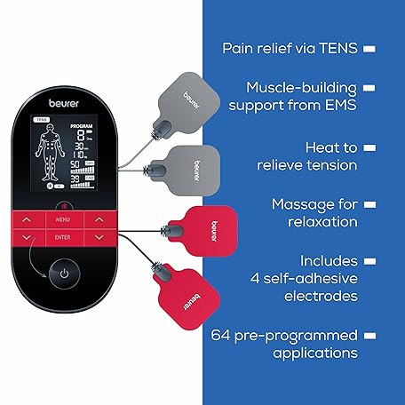 Thông tin sản phẩm Beurer EM59 Digital 3-in-1 TENS, EMS & Heat Therapy Device for Pain Relief and Massage, Muscle Stimulator with 2 Adjustable Channels, 64 Applications, Timer Function