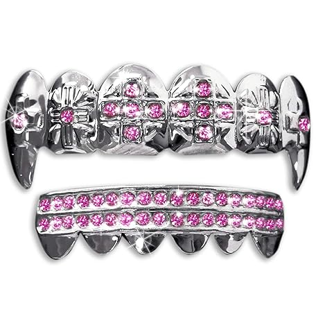 Big Dawgs Bling Hip Hop Silver Vampire Fangs Teeth Mouth Grillz Set (Pink Stones)