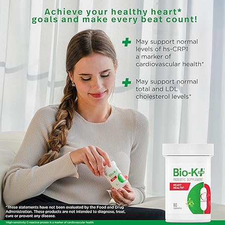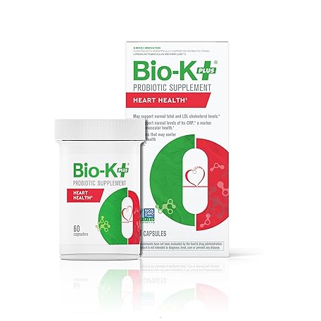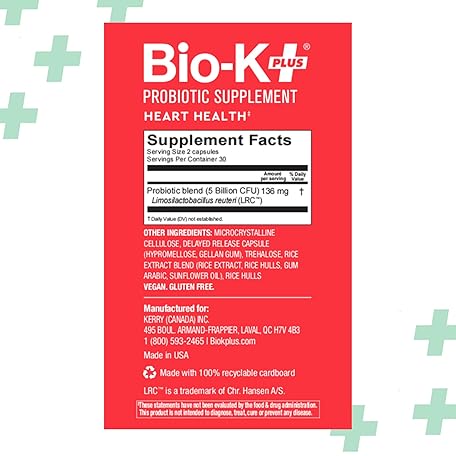 Thông tin sản phẩm Bio K+ Heart Health Probiotic with Limosilactobacillus reuteri LRC – 5 Billion CFU – Cholesterol & Cardiovascular Support – Vegan, Shelf-Stable, Non-GMO – Probiotics for Men & Women – 60 Capsules