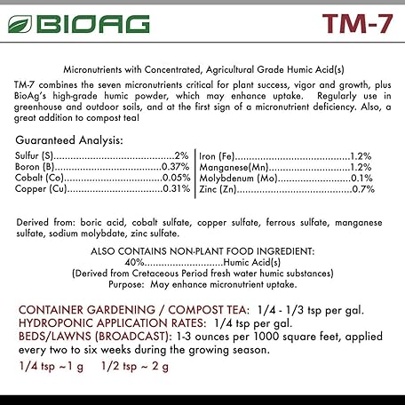 Thông tin sản phẩm BioAg TM7 Organic Humic Acid Soil Conditioner Plus Essential Micronutrients, Dry Amendment for All Plants, S B Co Cu Fe Mn Mo Zn (100 Grams)