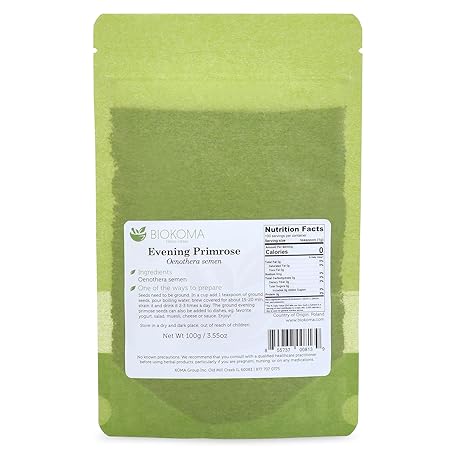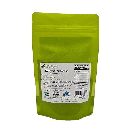 Biokoma Pure and Organic Evening Primrose Seeds 100g (3.55oz) in Resealable Moisture Proof Pouch - Herbal Tea, Kosher, No Additives, No Preservatives, Kosher