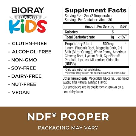 Thông tin sản phẩm BIORAY Kids NDF Pooper, Mango - 2 fl oz - Bowel Mover - Non-GMO, Vegan, Gluten Free - 30 Servings