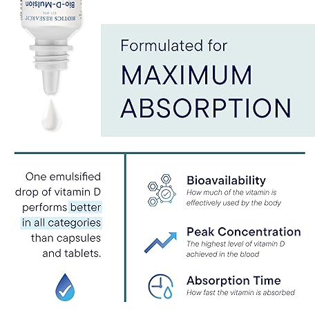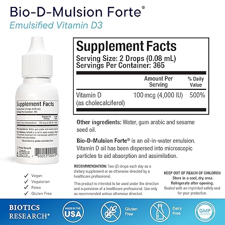 Thông tin sản phẩm Biotics Research Bio-D-Mulsion Forte Liquid Vitamin D Drops 4000 IU – Vitamin D3 2000iu /Drop for Adults –Best Absorption, Strengthens Bones, Supports Cardiovascular & Immune System -1 fl oz