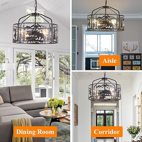 Black Bear Chandelier, Farmhouse Rustic 4 Lights Metal Round Pendant Light Werstern Cabin Light Fixturefor Dining Living Room Kitchen Island Foyer,E26 Socket, Height Adjustable, 17.3inches