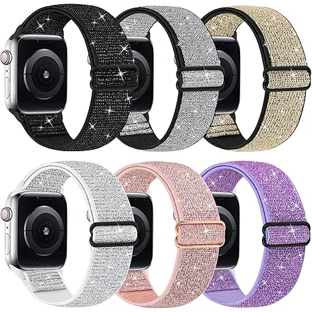 Bling Nylon Stretchy Bands Compatible With Apple Watch Bands 38mm 40mm 41mm 42mm 44mm 45mm 49mm For Women Girls, Adjustable Braided Solo Loop Sport Bands For iWatch Series Ultra 10 9 8 7 6 5 4 3 2 1 SE, 6 Packs
