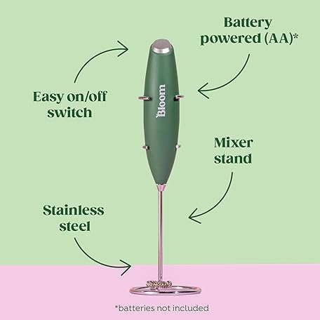 Thông tin sản phẩm Bloom Nutrition Milk Frother, Hand Mixer, Electric, Handheld Drink Stirrer, Frothing Wand, Foam Maker for Coffee, Matcha, Protein, Greens, Stainless Steel, Battery Operated, Includes Whisk Stand