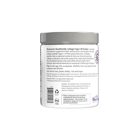 Thông tin sản phẩm Bluebonnet Nutrition Beautiful Ally Collagen Powder, Hydrolyzed Collagen from Grass Fed Cows, Collagen Peptides Type 1 & 3, Non GMO, Gluten Free, Soy Free, Milk Free, 28 Servings, Unsweetened, 6.9 Oz