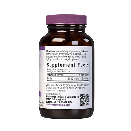 Thông tin sản phẩm BlueBonnet Nutrition Biotin 5000 mcg, Hair & Nail Support*, Non-GMO, Vegan, Kosher Certified, Gluten-Free, Soy-Free, Dairy-Free, 120 Vegetable Capsules, 120 Servings
