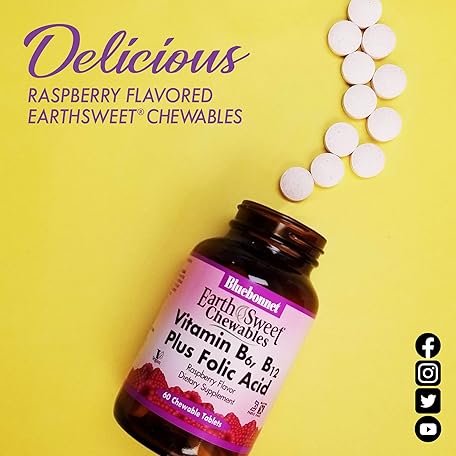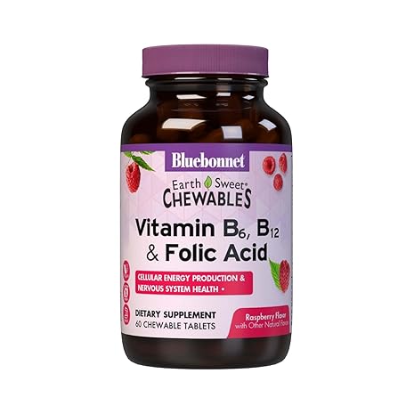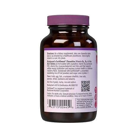 Thông tin sản phẩm BlueBonnet Nutrition Earth Sweet Vitamin B6, B12, Plus Folic Acid Chewable Tablets, Vegan, Vegetarian, Gluten Free, Soy Free, Milk Free, Kosher, 60 Chewable Tablets, Raspberry Flavor