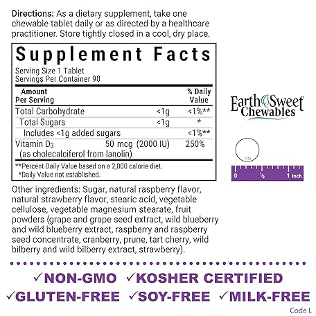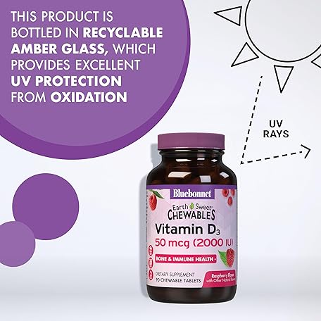 Thông tin sản phẩm Bluebonnet Nutrition Earth Sweet Vitamin D3 2000 IU Chewable Tablets, Aids in Muscle and Skeletal Growth, D3, Non GMO, Gluten, Free, Soy Free, Milk Free, Kosher, 90 Chewable Tablets, Raspberry Flavor