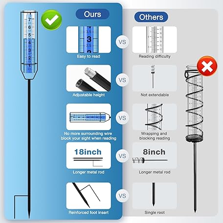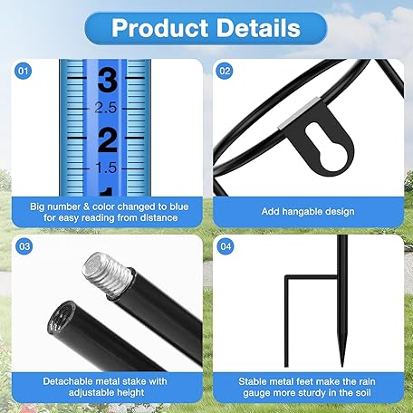 Thông tin sản phẩm BoArt Rain Gauge, 7" Freeze-Proof Thickened Transparent Plastic Rain Gauge Outdoor, Large Clear Numbers and Adjustable Height Rain Measuring Tool for Garden, Lawn, Patio, and Farm Use