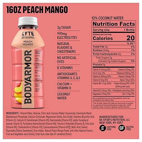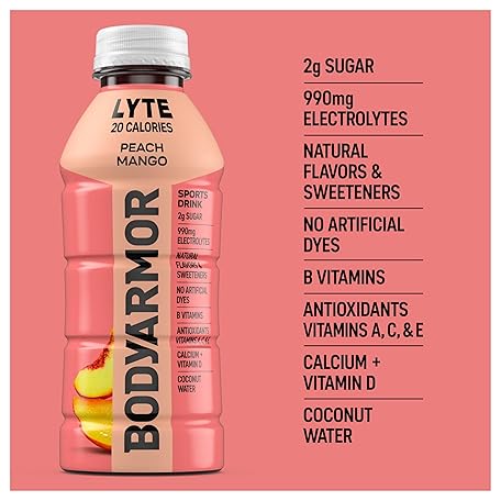 Thông tin sản phẩm BODYARMOR LYTE, Peach Mango, Electrolyte Drink, 20 Calories, 16 Fl Oz Bottles (12 Pack), Coconut Water Sports Drink, Natural Flavor & B Vitamins