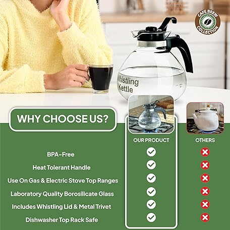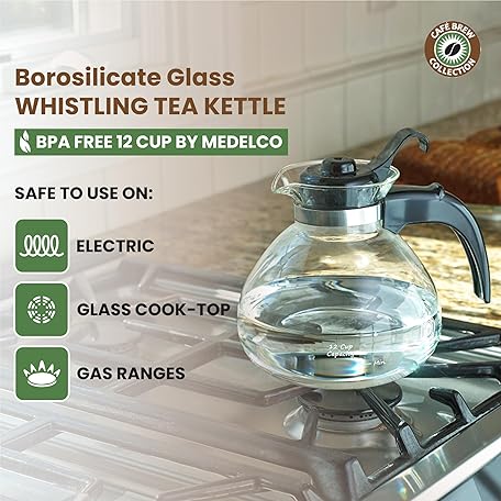 Thông tin sản phẩm Borosilicate Glass Stove Top Whistling Tea Kettle - 12 Cup/48oz Capacity - BPA-Free - German Made Glass Kettle for Gas, Electric, and Glass Ranges