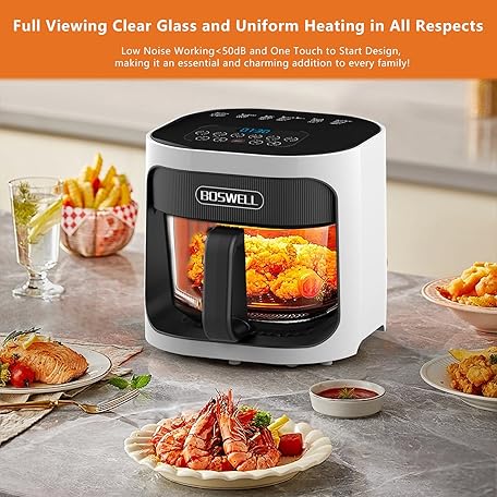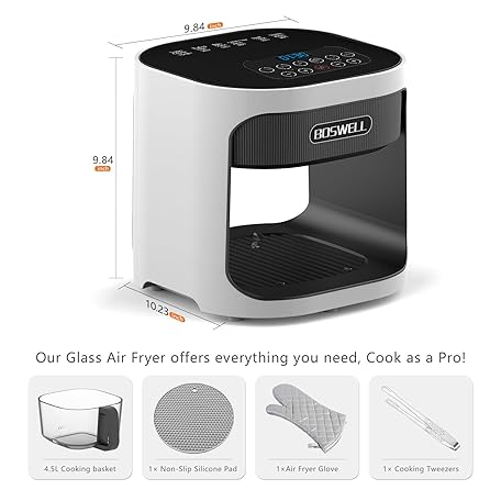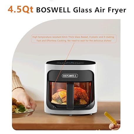 BOSWELL 4.5QT Glass Air Fryer - 6-in-1 with Transparent Bowl | Circulating Air for Crispy Results | Bake, Broil, Air Fry | Temperature Control, Dishwasher Safe (White)