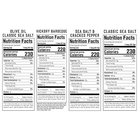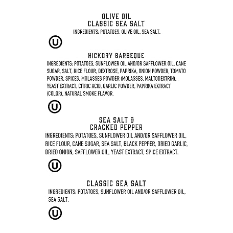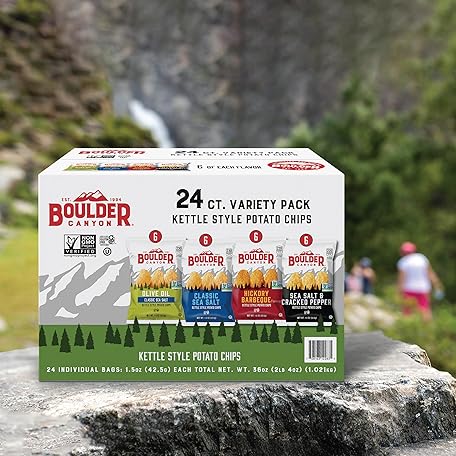 Thông tin sản phẩm Boulder Canyon Kettle Style Potato Chips Variety Pack, 24 Count, Assorted 1.5oz. Bags, Olive Oil Classic Sea salt, Hickory BBQ, Sea Salt & Cracked Pepper, Classic Sea salt