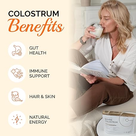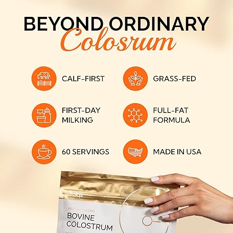 Bovine Colostrum Powder – First-Day Milking for Immune & Gut Support – 60 Servings – Supports Skin & Tissue Health – Made in USA - Amino Acids, Vitamins, Minerals – Kosher - Sustainably Sourced