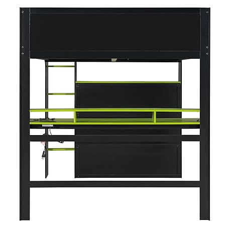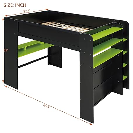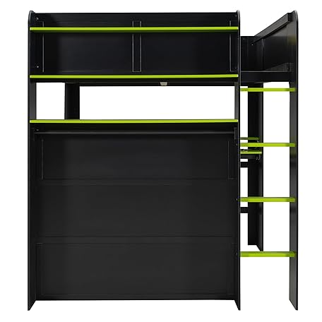 • Brabrety Full Size Wood Bunk Bed with Height-Adjustable Desk,Wardrobe,Ample Storage Space,and RGB Light (Green#66)