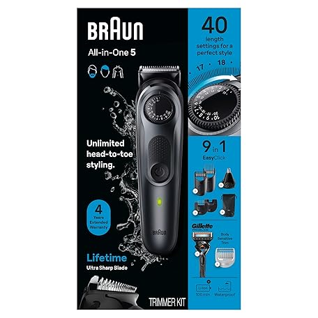 Thương hiệu Braun là cái tên nổi tiếng được rất nhiều khách hàng trên thế giới chọn lựa. Với kiểu dáng đẹp mắt, sang trọng, sản phẩm Braun All-in-One Style Kit Series 5 5470, 9-in-1 Trimmer for Men w/Beard Trimmer, Body Trimmer for Manscaping, Gillette Fusion5 ProGlide Razor, 40 Length Settings, Rechargeable Battery, Cordless là sự lựa chọn hoàn hảo nếu bạn đang tìm mua một món cho riêng mình.