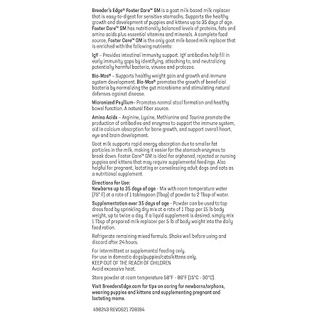 Thông tin sản phẩm Breeder's Edge Foster Care GM - Goat Milk Based Powdered Milk Replacer - Puppies , Kittens , Cats & Dogs Formula - Easy Digestion - 1 lb