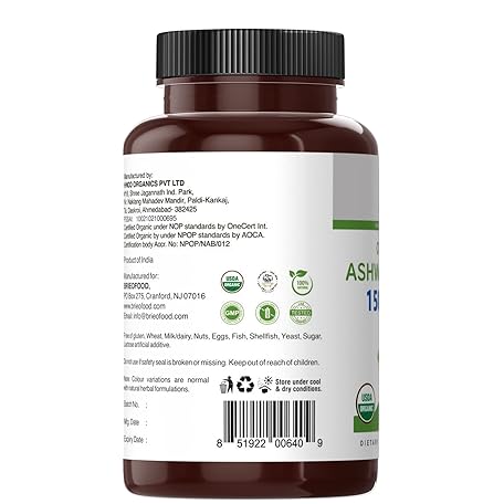 Thông tin sản phẩm Brieofood Organic Ashwagandha 1500mg, 45 Servings, Vegetarian, Gluten Free, 90 Vegetarian Tablets
